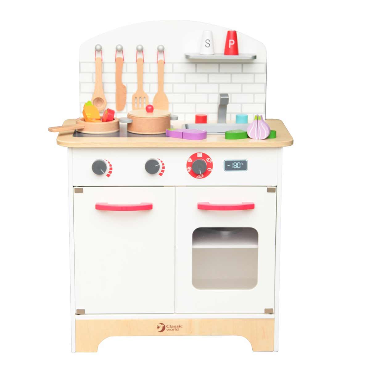Дървената кухня на Classic World, направена специално за вашите малки готвачи, е изработена от избрани висококачествени и напълно безвредни материали.