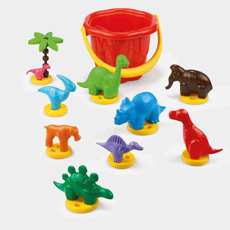 Върнете се векове назад и се потопете в света на динозаврите заедно с вашето дете благодарение на този шарен комплект. Всеки динозавър е изобразен в различен цвят и това допълнително помага на малчугана ви да научи цветовете, играейки си. Кофичката пък позволява на детето ви да ги пренася бързо и лесно и така то може да ги взима нявсякъде, където поиска. А след като приключи играта с комплекта, малчуганът ви може просто да върне динозаврите обратно в кофата, което пък ще го научи на умение да съхранява играчките и останалите си вещи.