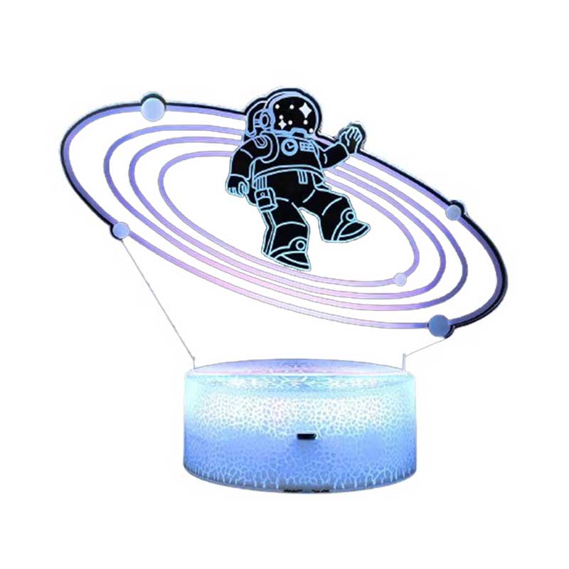С нейния 3D дизайн, тя ще впечатли всеки малък изследовател. С включеното дистанционно управление може да регулирате яркостта, мигащата светлината и смяната на цветове (червен, зелен и син или монохроматичен), само чрез един бутон. Лампата е изключително практична и ще пасне на всяко детско шкафче. Моделът работи с батерии (3хАА) или чрез включване на USB кабела от комплекта. Той е чудесен подарък, който развива въображението, креативността и помага на малчуганите да заспят лесно и комфортно. Фигурата на космонавт ще породи любознателност и много въпроси за космоса, които вълнуват децата.