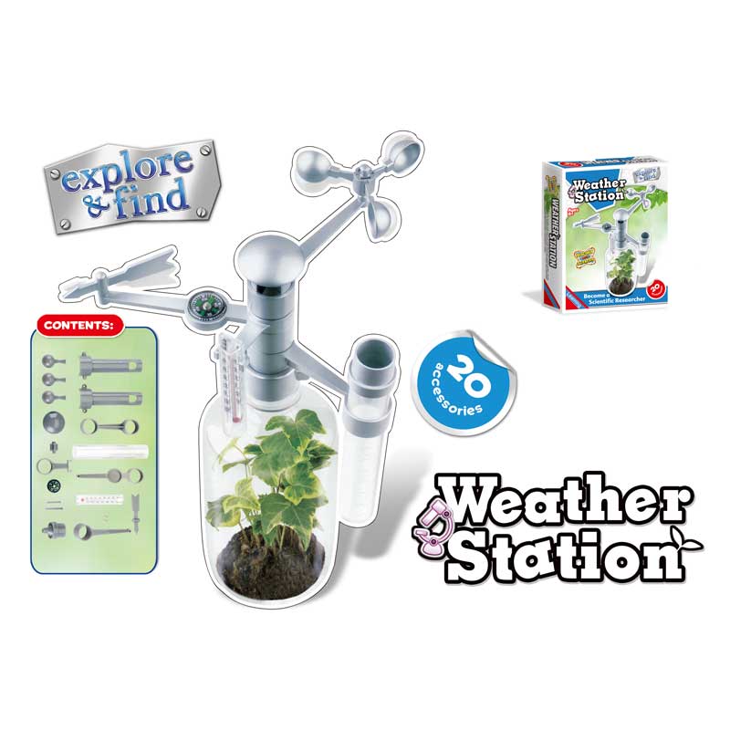 Нашият STEAM комплект включва ветропоказател, анемометър, термометър и дъждомер. Измервайте различни метеорологични явления като скорост и посока на вятъра, количество на валежите, температура на въздуха и т.н. Тази играчка ви дава всичко необходимо, за да се превърнете в истински метеоролог. С нея също така ще можете да експериментирате с парниковия ефект и да създадете същински растителен терариум в бутилка. Комплектът помага на вашите малчугани да развият въображението, сръчността и логиката си, учейки ги на важни умения като грижата за околния свят. Благодарение на своята метеорологична станция те ще разкрият тайните на времето и ще се сблъскат с неговите състояния.