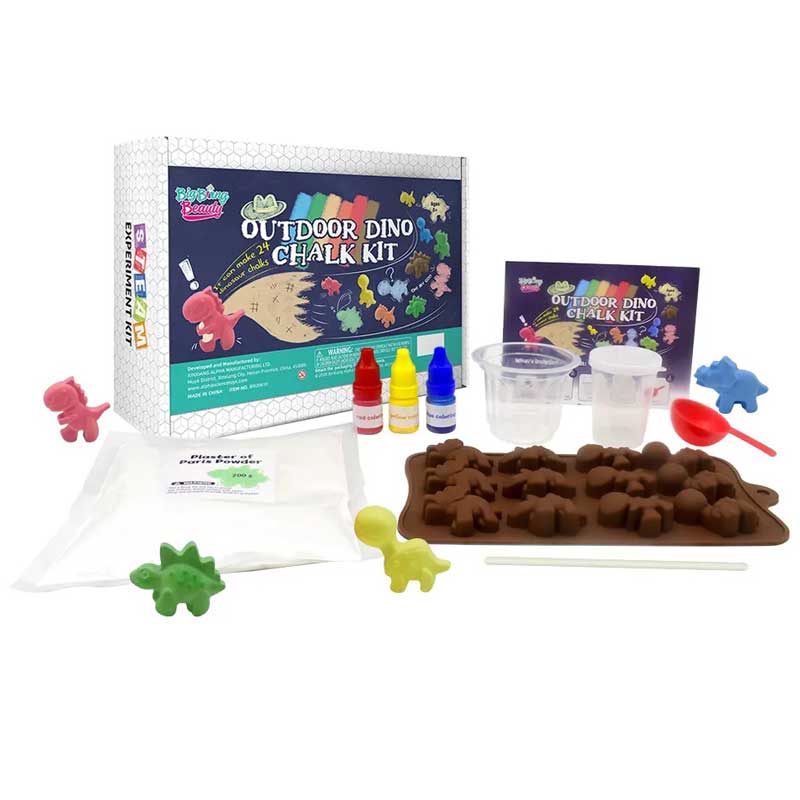 Обичате да рисувате с тебешири пред блока или на площадката за игра? Тогава този STEAM комплект е точно за вас, защото с него ще можете сами да си направите цветен тебешир и то във формата на динозавър! Следвайте само стъпките от ръководството за употреба.