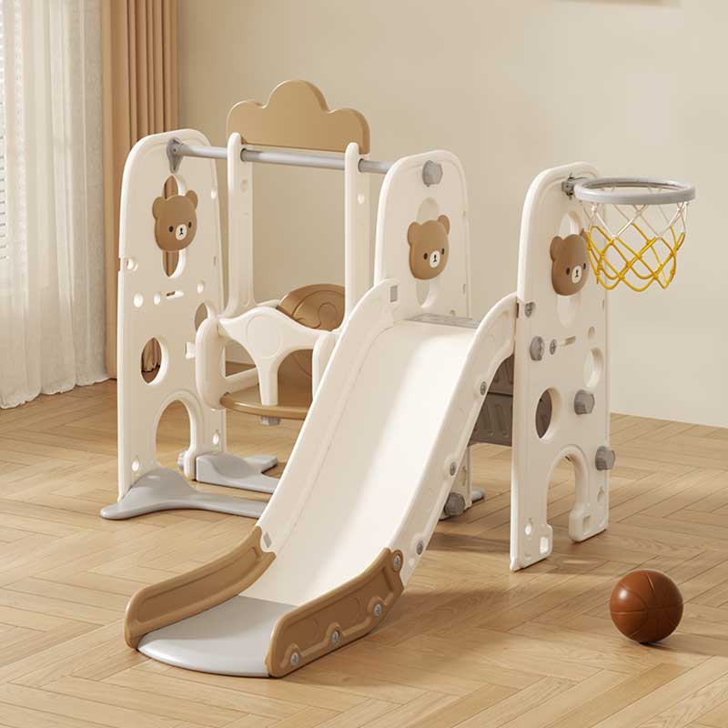 Детска пластмасова пързалка с люлка и баскетболен кош, Кафяво мече