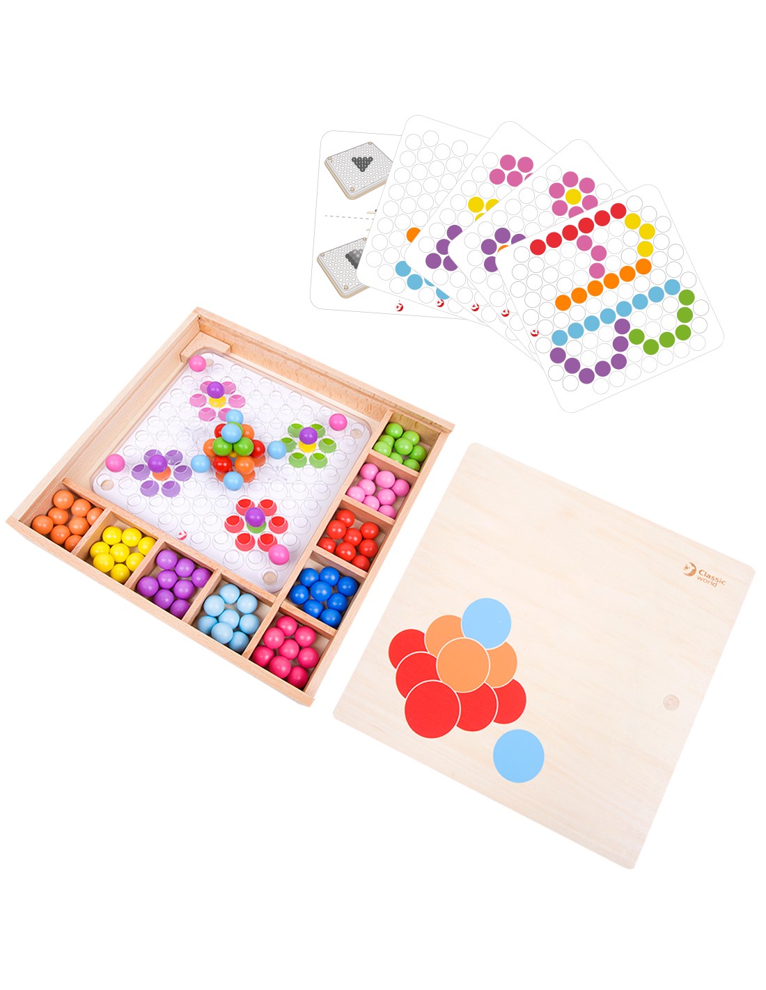 Мозайката се състои от 9 цвята топченца, дъска за нареждане и няколко примерни картинки с фигури, всичко това в страхотна дървена кутия за съхранение, която е много удобна за пренасяне при пътуване.
